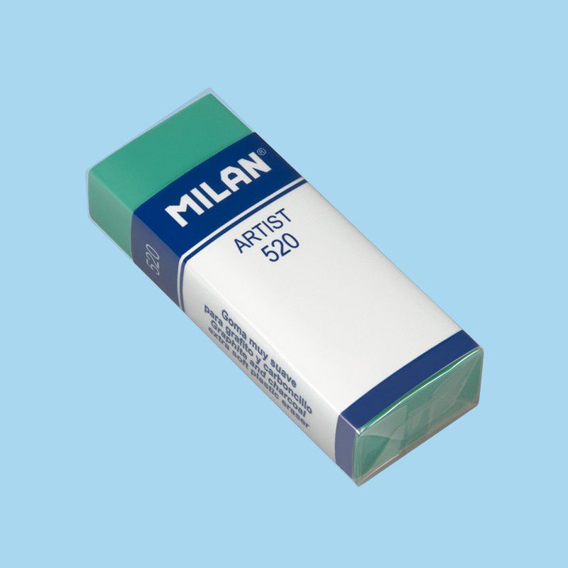 Gomme nata® en plastique souple vert, pour effacer les traits de crayon sur n'importe quelle surface. Emballés individuellement. Avec pochette en carton. Taille de la gomme : 6,1 x 2,3 x 1,2 cm. Les gommes MILAN sont fabriquées en Espagne depuis 1918.