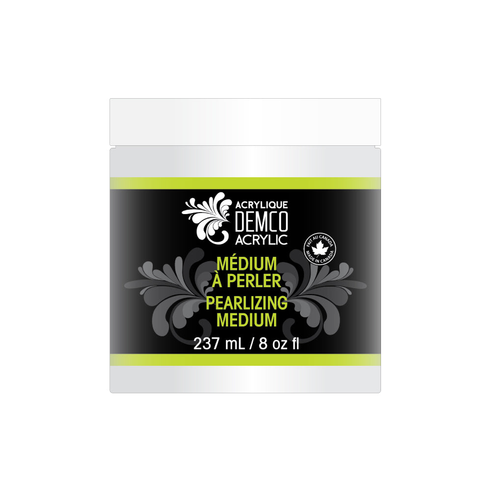 Le medium à perler donne un effet nacré lorqu’il est mélangé à la peinture acrylique. Mélanger un ratio 1 :1 en fonction de l’intensité d’effet nacré souhaité.