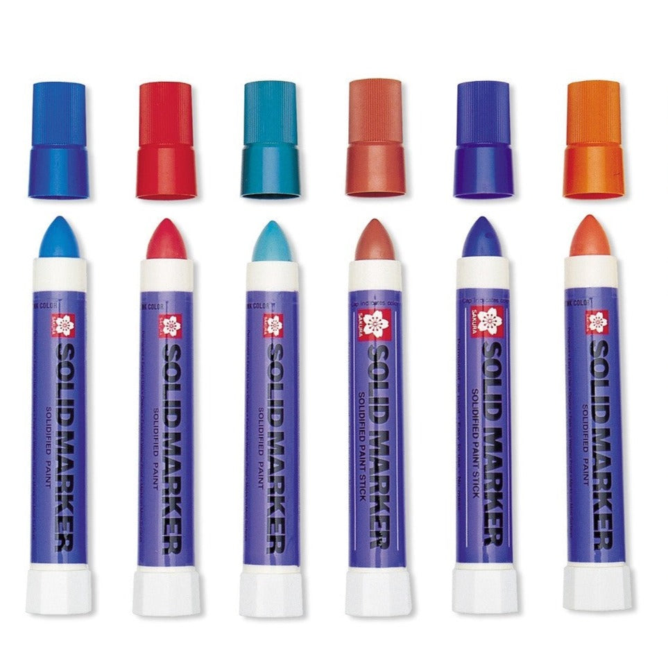 Solid Marker est une peinture solidifiée sous forme de marqueur proposée en tailles standard et fines. Il marque à travers la poussière, la rouille, l'eau – à l'intérieur ou à l'extérieur sur des surfaces lisses ou rugueuses. Sèche en quelques minutes et est permanent une fois sec. Le marqueur solide ne se décolore pas et ne s'efface pas comme la craie. Le mécanisme de rotation garde la peinture fraîche et prête à l'emploi. Le marqueur solide présente un trait résistant et large, un temps de séchage rapide, une faible odeur et est non toxique.